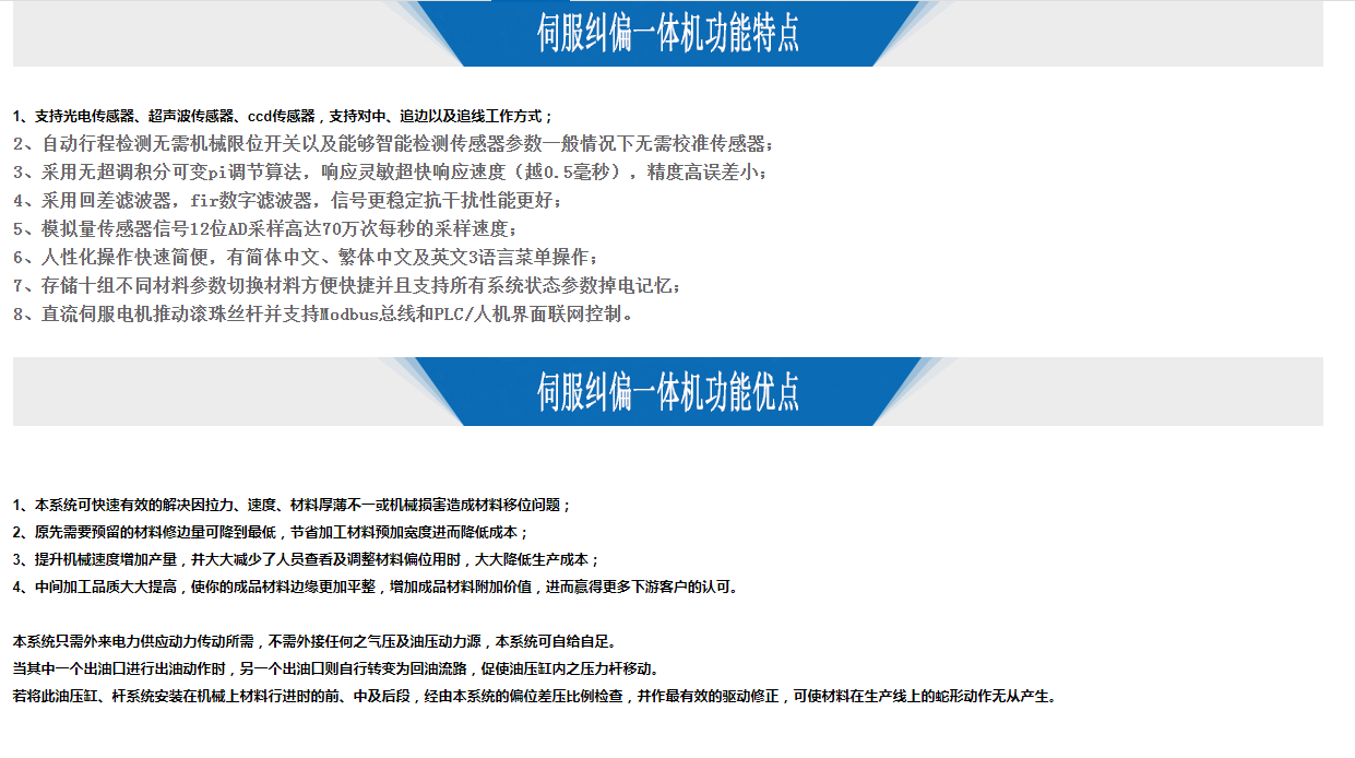 纠偏一体机,伺服纠偏一体机支持����� ����� �������Ƴ����������� �������Ƴ����������� �������Ƴ������������ �������Ƴ��������������Ƴ�������光����� �������Ƴ������������ �������Ƴ������������ �������Ƴ������������ �������Ƴ�������电传感器、超声波传感器、ccd传感器����� �������Ƴ������������ �������Ƴ������������ �������Ƴ������������ �������Ƴ�������,支持对中、追边以及追线工作方����� �������Ƴ����������� �������Ƴ������������ �������Ƴ������������ �������Ƴ�������式;自动行程检测无需机械限位开关以及���������� �������Ƴ������������ �������Ƴ������������ �������Ƴ������������ �������Ƴ������� �������Ƴ�������能够����� �������Ƴ����������� �������Ƴ������������ �������Ƴ������������ �������Ƴ�������智能检测传感器参数一般情况下无需校����� �������Ƴ������������ �������Ƴ������������ �������Ƴ������������ �������Ƴ�������准传感器。