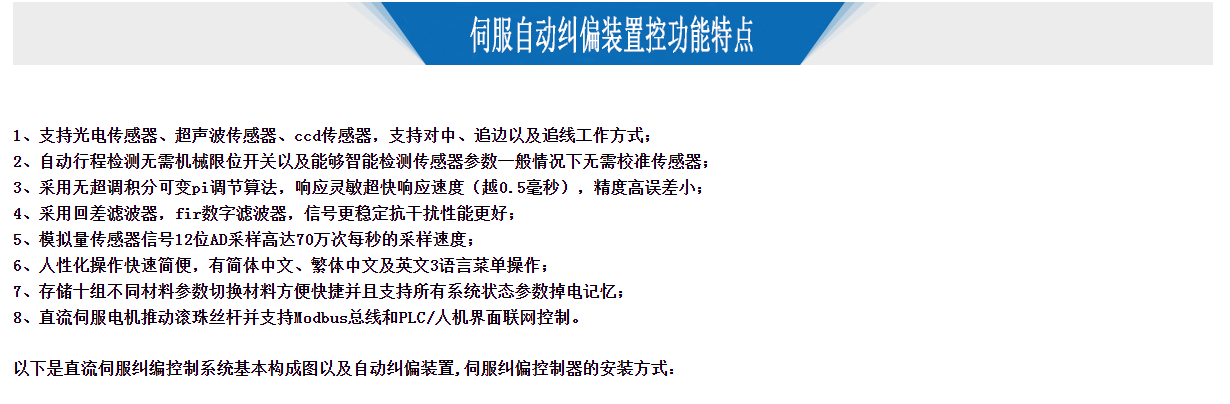伺服自动纠偏装置,伺服纠偏控����� �������Ƴ������������ �������Ƴ������������ �������Ƴ������������ �������Ƴ������制器采用无超调积分可变pi调节算法及����� �������Ƴ������������ �������Ƴ����������� �������Ƴ������������ �������Ƴ�������高速32位主频72M的cpu驱动直流����� �������Ƴ������������ �������Ƴ������������ �������Ƴ����������� �������Ƴ�������伺服电机,响应超快越每分����� �������Ƴ������������ �������Ƴ������������ �������Ƴ����������� �������Ƴ�������钟2000次。