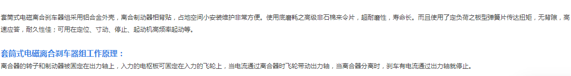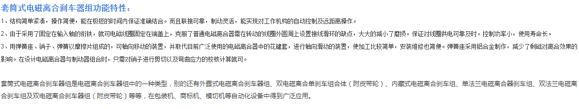 套筒式电磁离合刹车器组采用铝合金外����� �������Ƴ������������ �������Ƴ������������ �������Ƴ������������ �������Ƴ�������壳,离合制动器相背贴,占地空间小安装维����� �������Ƴ������������ �������Ƴ������������ �������Ƴ������������ �������Ƴ�������护非常方便。使用底磨耗之高����� �������Ƴ������������ �������Ƴ������������ �������Ƴ������������ �������Ƴ������级非石棉来令片,超耐磨性,寿����� �������Ƴ������������ �������Ƴ����������� �������Ƴ������������ �������Ƴ�������命长。而且使用了定负荷之板型弹簧����� �������Ƴ������������ �������Ƴ������������ �������Ƴ������������ �������Ƴ�������片传达扭矩,无背隙,高速应答,耐久性佳����� �������Ƴ������������ �������Ƴ������������ �������Ƴ������������ �������Ƴ�������;可用在定位、寸动、停止、起动机高频率����� �������Ƴ������������ �������Ƴ����������� �������Ƴ������������ �������Ƴ�������起动等。