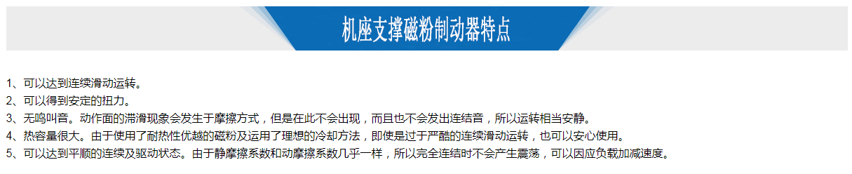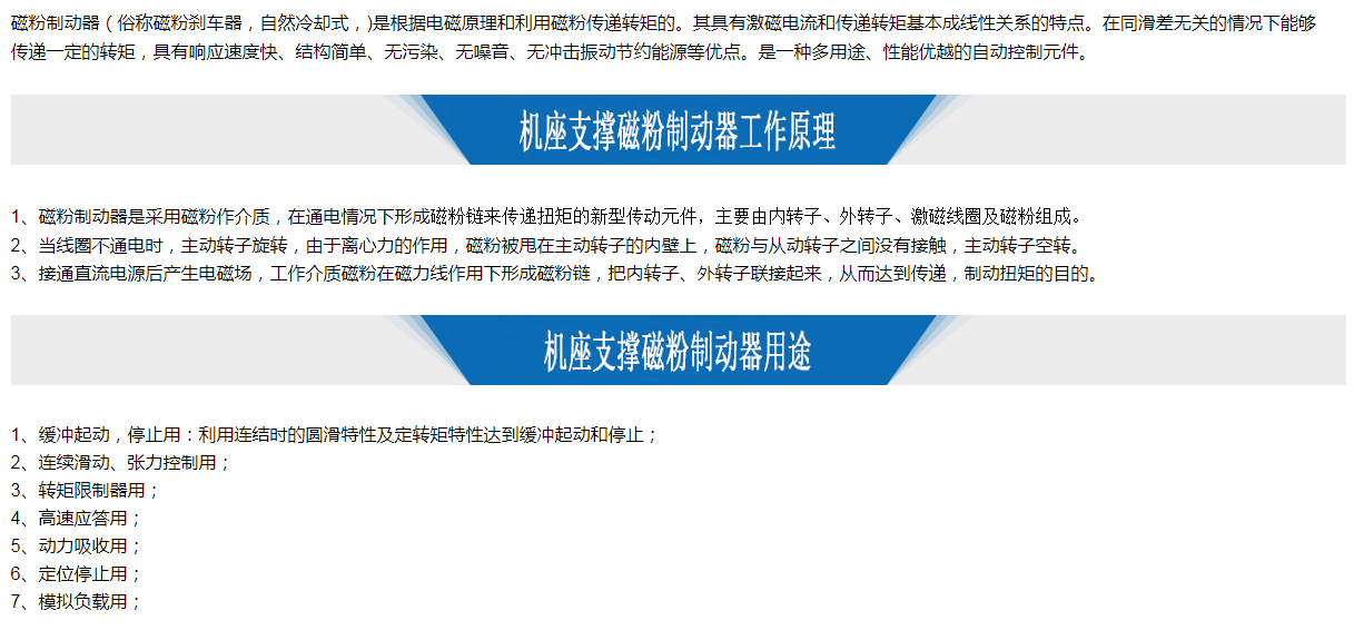 磁粉制动器(俗称磁粉刹车器,自����� �������Ƴ������������ �������Ƴ������������ �������Ƴ����������� �������Ƴ�������然冷却式,)是根据电磁原理和利����� �������Ƴ������������ �������Ƴ������������ �������Ƴ������������ �������Ƴ�������用磁粉传递转矩的。其具有激磁电����� �������Ƴ������������ �������Ƴ������������ �������Ƴ������������ �������Ƴ�������流和传递转矩基本成线性关系的特点。在同滑差无关的����� �������Ƴ����������� �������Ƴ������������ �������Ƴ������������ �������Ƴ������情况下能够传递一定的转矩,具有响应速����� �������Ƴ������������ �������Ƴ������������ �������Ƴ������������ �������Ƴ�������度快、结构简单、无污染、无噪音、无����� �������Ƴ������������ �������Ƴ������������ �������Ƴ������������ �������Ƴ������冲击振动节约能源等优点。是一种多用途、性能优越的����� �������Ƴ������������ �������Ƴ������������ �������Ƴ������������ �������Ƴ�������自动控制元件。