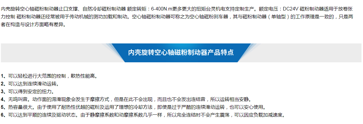 内壳旋转空心轴磁粉制动器止口支撑、自然冷����� �������Ƴ������������ �������Ƴ������������ �������Ƴ������������ �������Ƴ�������却磁粉制动器 额定转矩:6����� �������Ƴ������������ �������Ƴ������������ �������Ƴ����������� �������Ƴ�������-400N.m更多更大的扭矩台灵机电支持定制生产����� �������Ƴ����������� �������Ƴ������������ �������Ƴ������������ �������Ƴ�������。额定电压:DC24V 磁粉����� �������Ƴ������������ �������Ƴ������������ �������Ƴ������������ �������Ƴ�������制动器适用于放卷张力控制 磁粉制动器还经常被用于����� �������Ƴ������������ �������Ƴ������������ �������Ƴ������������ �������Ƴ�������传动机械的测功加载和制动。