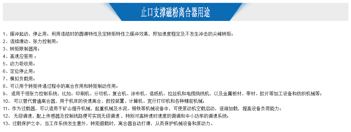 磁粉离合器又称电磁粉离合器、磁粉式离����� �������Ƴ������������ �������Ƴ������������ �������Ƴ������������ �������Ƴ�������合器(轴输出、轴输入、止口支撑、水冷却)����� �������Ƴ����������� �������Ƴ����������� �������Ƴ������������ �������Ƴ�������,是根据电磁原理和利用磁粉传递转矩的,具有激磁电����� �������Ƴ������������ �������Ƴ������������ �������Ƴ������������ �������Ƴ�������流和传递转矩基本成线性关系,在同滑差无关的情况下����� �������Ƴ������������ �������Ƴ������������ �������Ƴ����������� �������Ƴ�������能够传递一定的转矩,具有响应速度快、结构简单、无����� �������Ƴ������������ �������Ƴ������������ �������Ƴ������������ �������Ƴ�������污染、无噪音、无冲击振动节约能����� �������Ƴ����������� �������Ƴ������������ �������Ƴ������������ �������Ƴ�������源等优点,是一种多用途、性能优越的自动控����� �������Ƴ������������ �������Ƴ����������� �������Ƴ������������ �������Ƴ�������制元件。